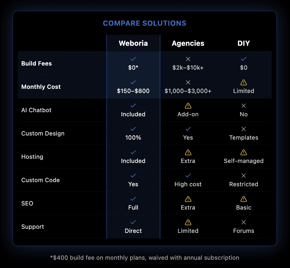 Weboria is a team of web design experts dedicated to making premium websites accessible and effective. We help businesses establish powerful online presences, capture more leads, and scale with professional, managed web solutions.